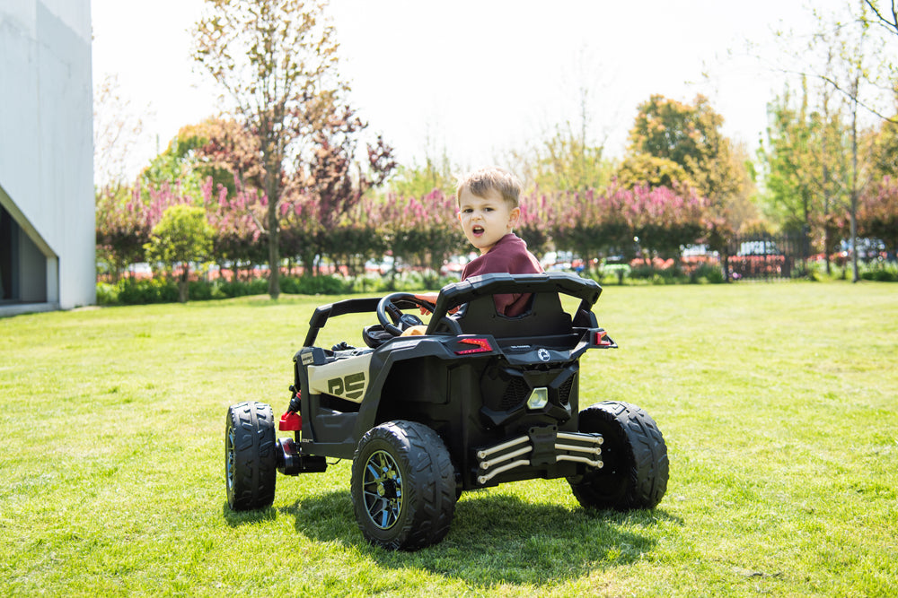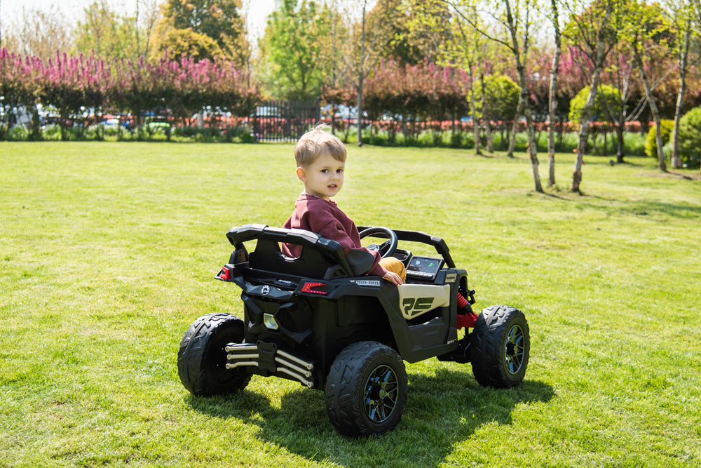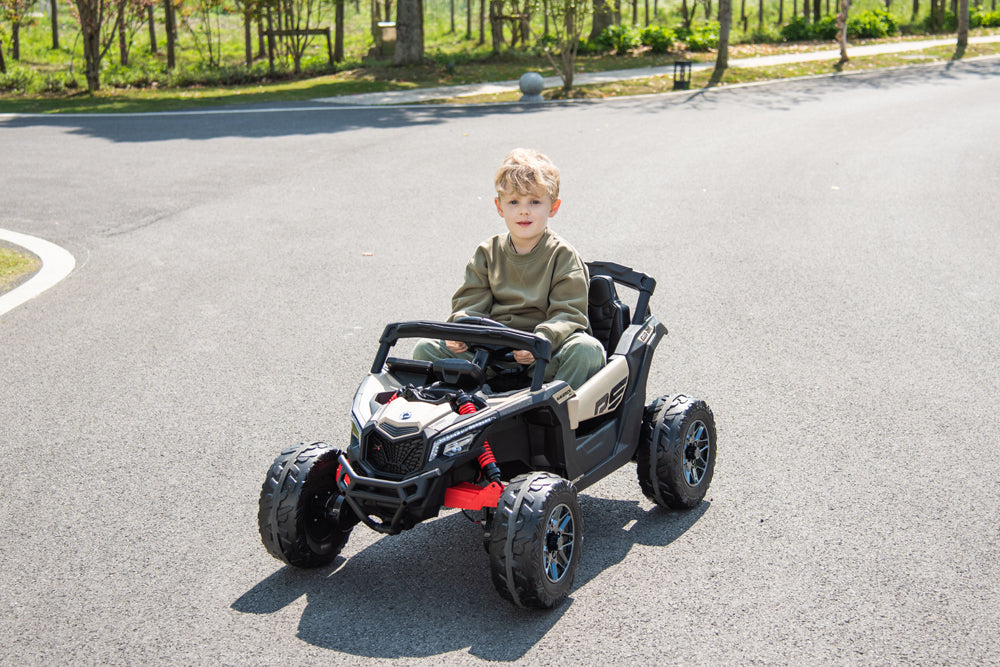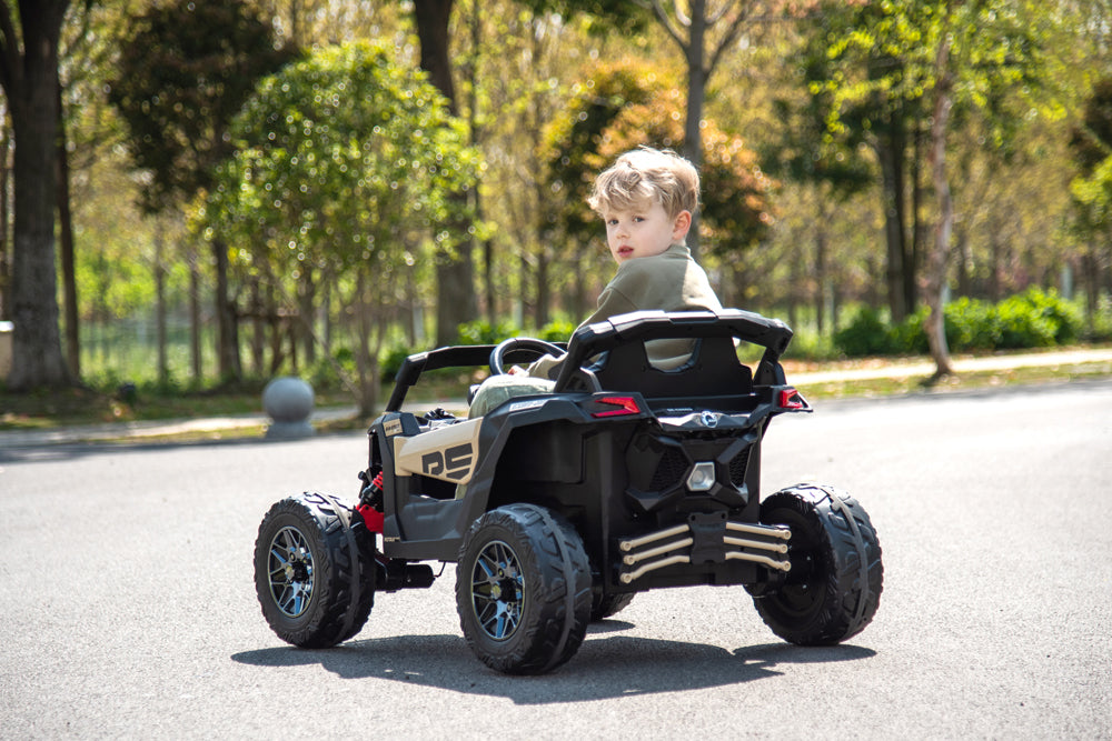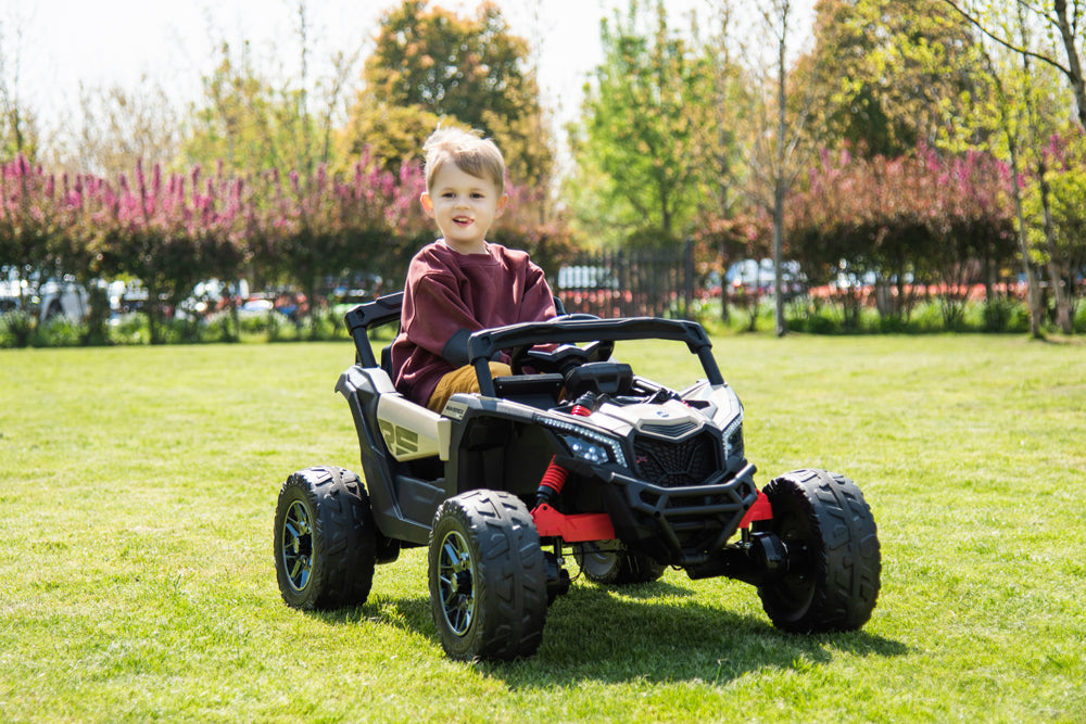 The Can Am Maverick 24V UTV offers young adventurers aged 1-5 years old the ultimate ride-on experience. This officially licensed electric UTV is powered by four potent 200W motors and a sturdy 24V battery, delivering a thrilling top speed of 5MPH and providing up to 50 minutes of fun on a full charge. It stands out with its 2.4G remote parental control, three-speed modes, and manual 22/44 switch for tackling various terrains. Safety features include a two-point seat belt, an emergency stop button, and 30 meters of remote control override. Packed with entertainment options such as MP3/USB inputs, radio, Bluetooth, and speakers, along with vibrant LED lights and a convenient button start, it's designed to deliver endless fun and safe rides.