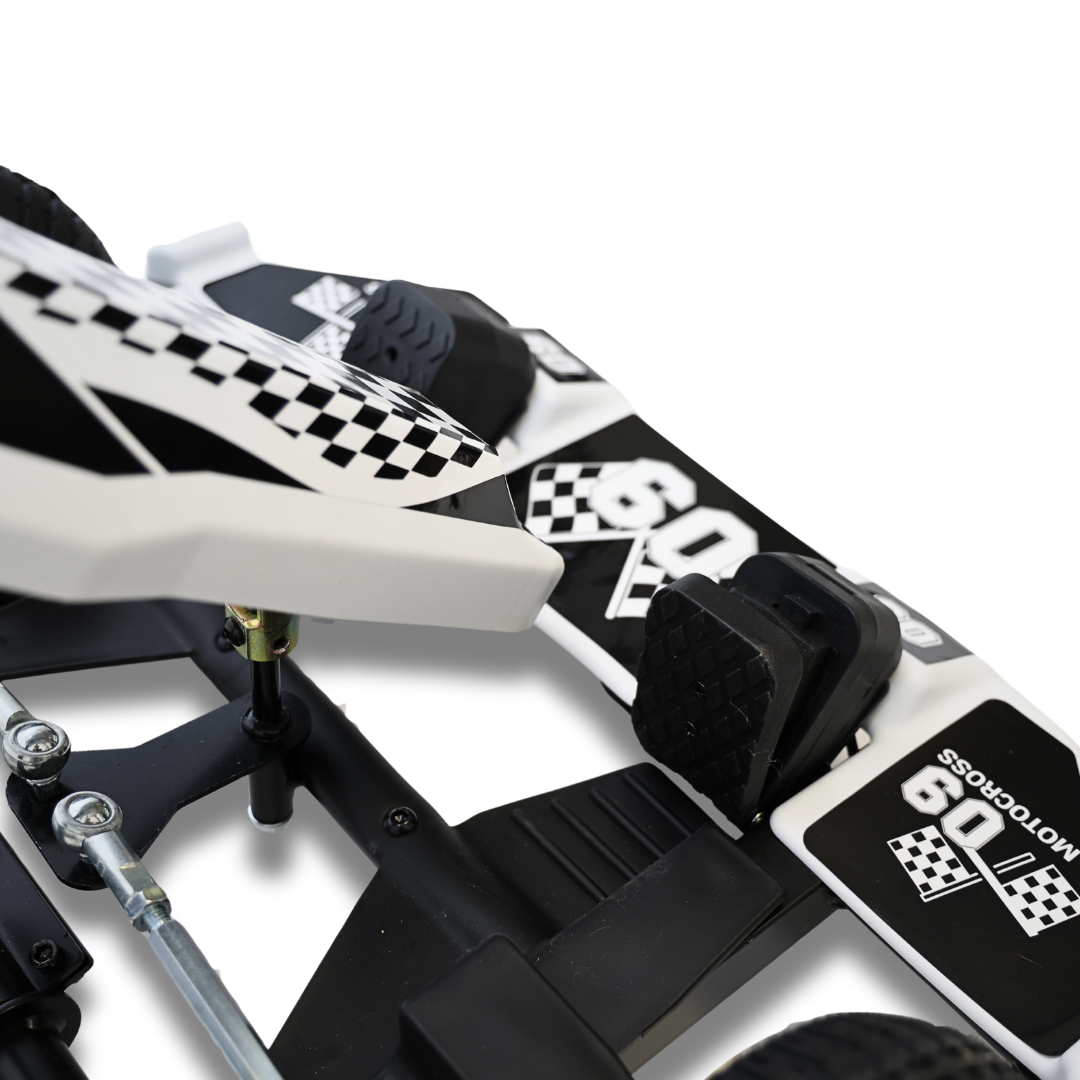 Kids can connect their favorite music to the Bluetooth sound system and enjoy every ride in style and rhythm. The go-kart stops by itself when the driver lifts their foot off the pedal for safety and control. But if you need to stop completely, brake quickly, or just have more fun racing, the handbrake is right there at your fingertips.